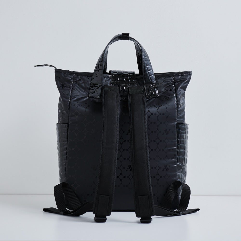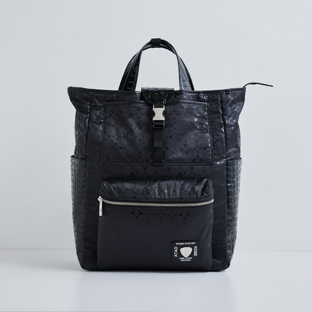 モノグラムでありながらも控えめなビジネスシーンにも取り入れやすい「both」。ATAOのテキスタイルにフォーカスしたbothは、ブラックの撥水リサイクルナイロン(ポリエステル)にシックに艶めくモノグラム柄と、イタリアンエナメルレザーの切り替えしがクールな逸品。エナメルレザーにはグリッター加工(パール加工)を施し、気になる指紋が目立ちにくい仕様。クッション性のある裏地をいれたボンディング加工で、パソコンを直接収納できるポケット付き。リュックを背負っている事を忘れてしまうほど非常に軽量で、ビジネスシーンにも最適。取引先への挨拶には、リュックのショルダーベルトをサイドのポケットしサッと収納し、トート型としてスッキリお持ちいただく事も。15インチのパソコンも難なく収納可能なデザイン?機能性ともに満足度の高い万能リュックです。ATAO(アタオ)(あたお)(リュック)(バックパック)(メンズ)(ユニセックス)(男女兼用)(男性も使える)(ナイロン)(イタリアレザー)(ビジネスバッグ)(ビジネスリュック)(通勤バッグ)(仕事バッグ)(オフィスコーデ)(トートバッグ)(A4サイズ)(パソコン)(both)(ボウス)(ぼうす)(両方)