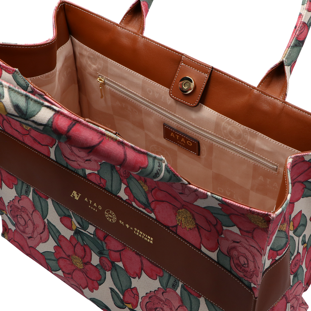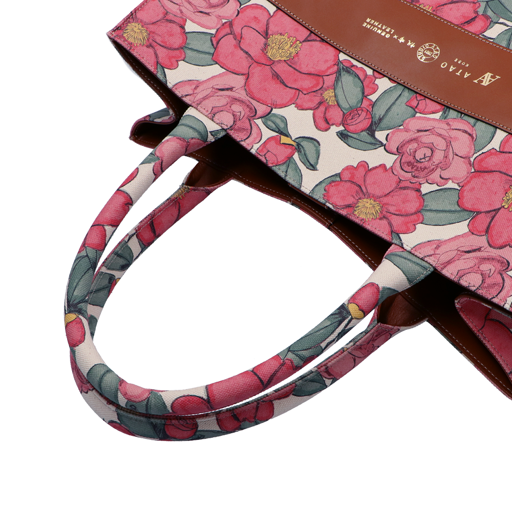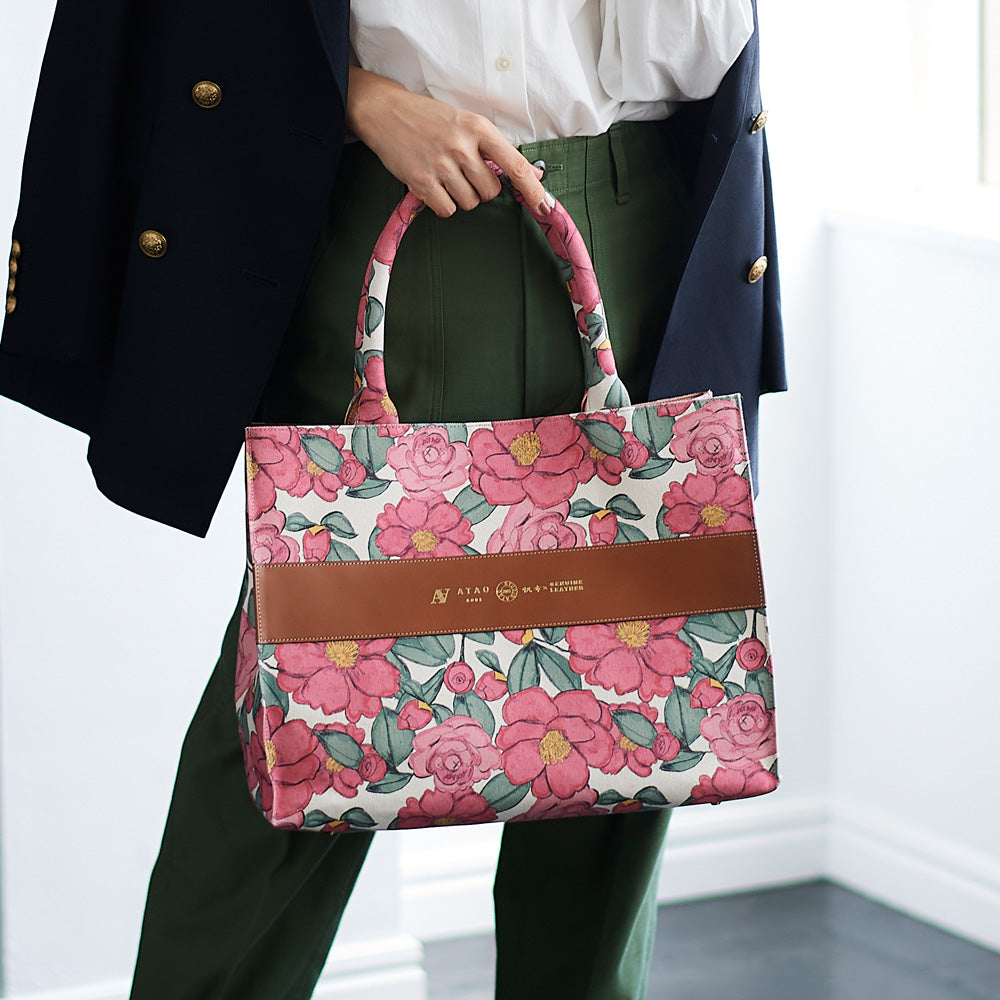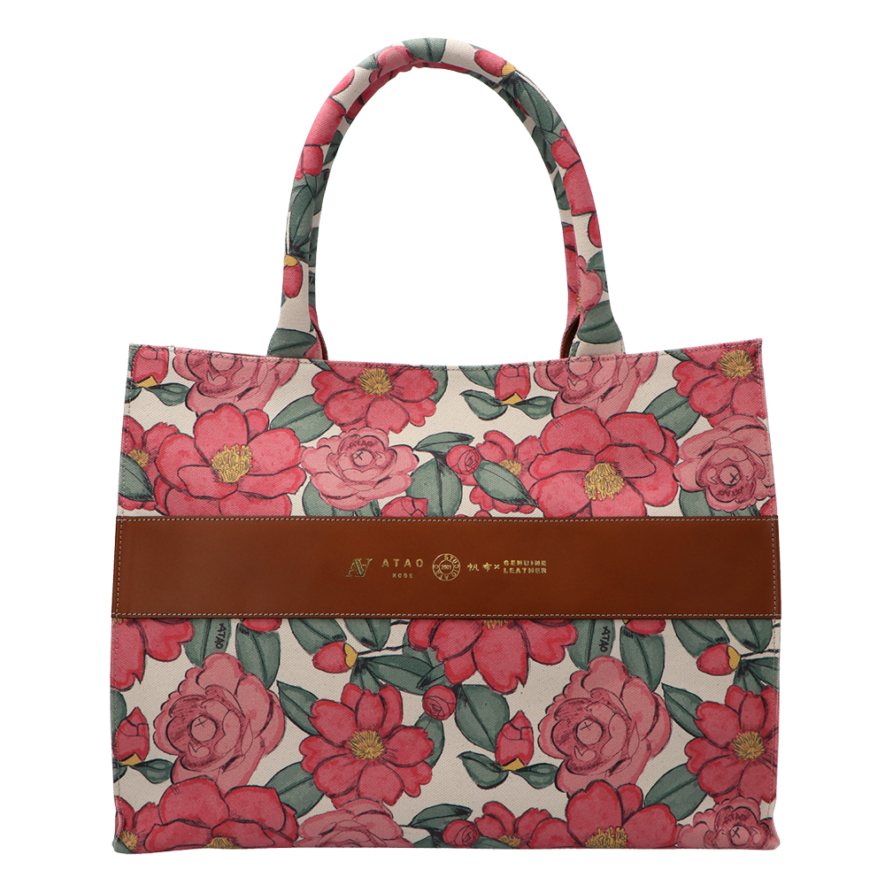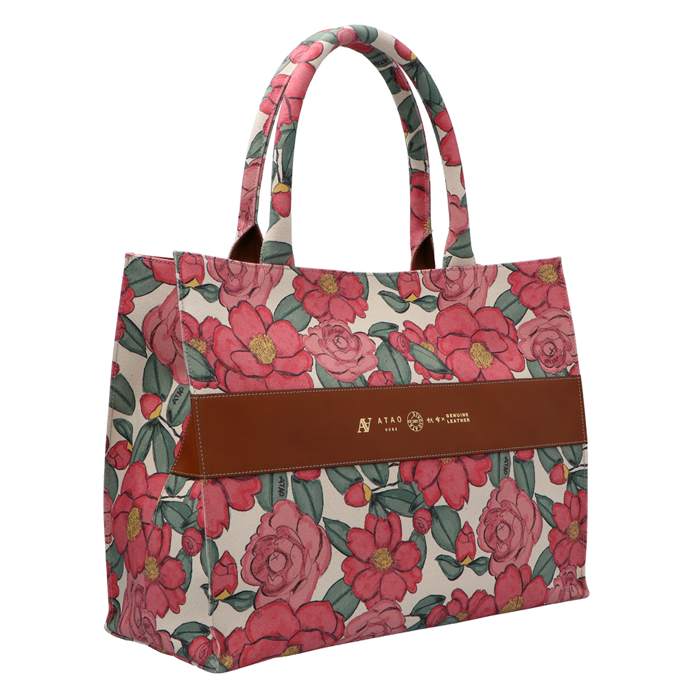 ATAO(アタオ)が咲かせる大輪の「サザンカ」が新たな物語を刻む。「Camellia sasanqua(カメリアサザンカ)」。サザンカは神戸を象徴するシンボルツリー。神戸ブランドATAOにふさわしい花と言えます。ATAOのデザイナーが描いた鮮やかなサザンカのアートを、職人による繊細な色付けでバッグというスクリーンに表現した「Cinema(シネマ)」。この新たなテキスタイルからATAOの新しい物語が始まろうとしています。(A4バッグ)