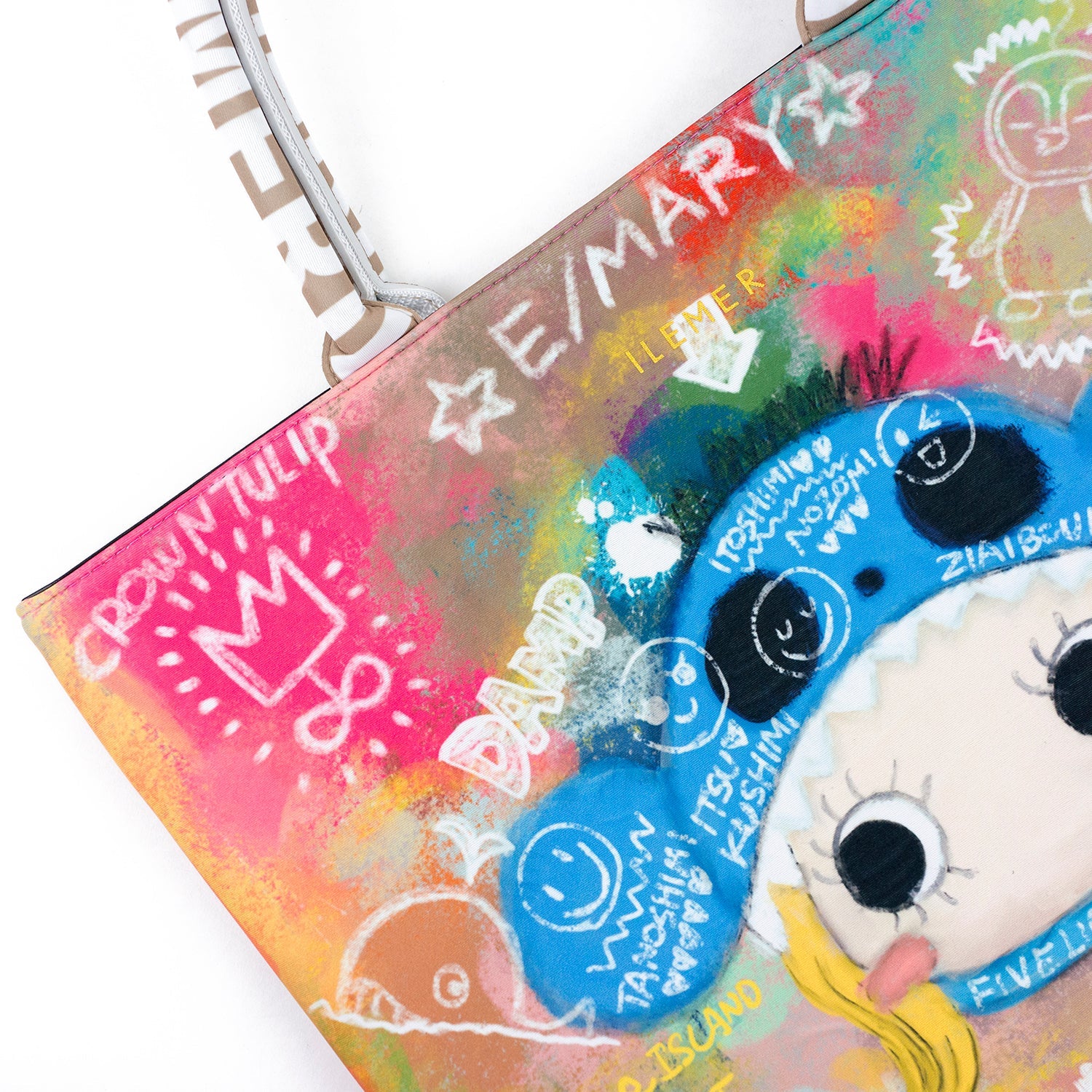 非常に軽くて柔らかい人気のエアリートート「LUNLUN」。(ルンルン)(るんるん)(トートバッグ)(肩がけ)(ワンショルダー)ウエットスーツに使用されるネオプレーン素材に手書きのILEMER(イルメール)(いるめーる)オリジナルのイラストがプリントされたトートバッグ。(イーマリー)(カラフル)