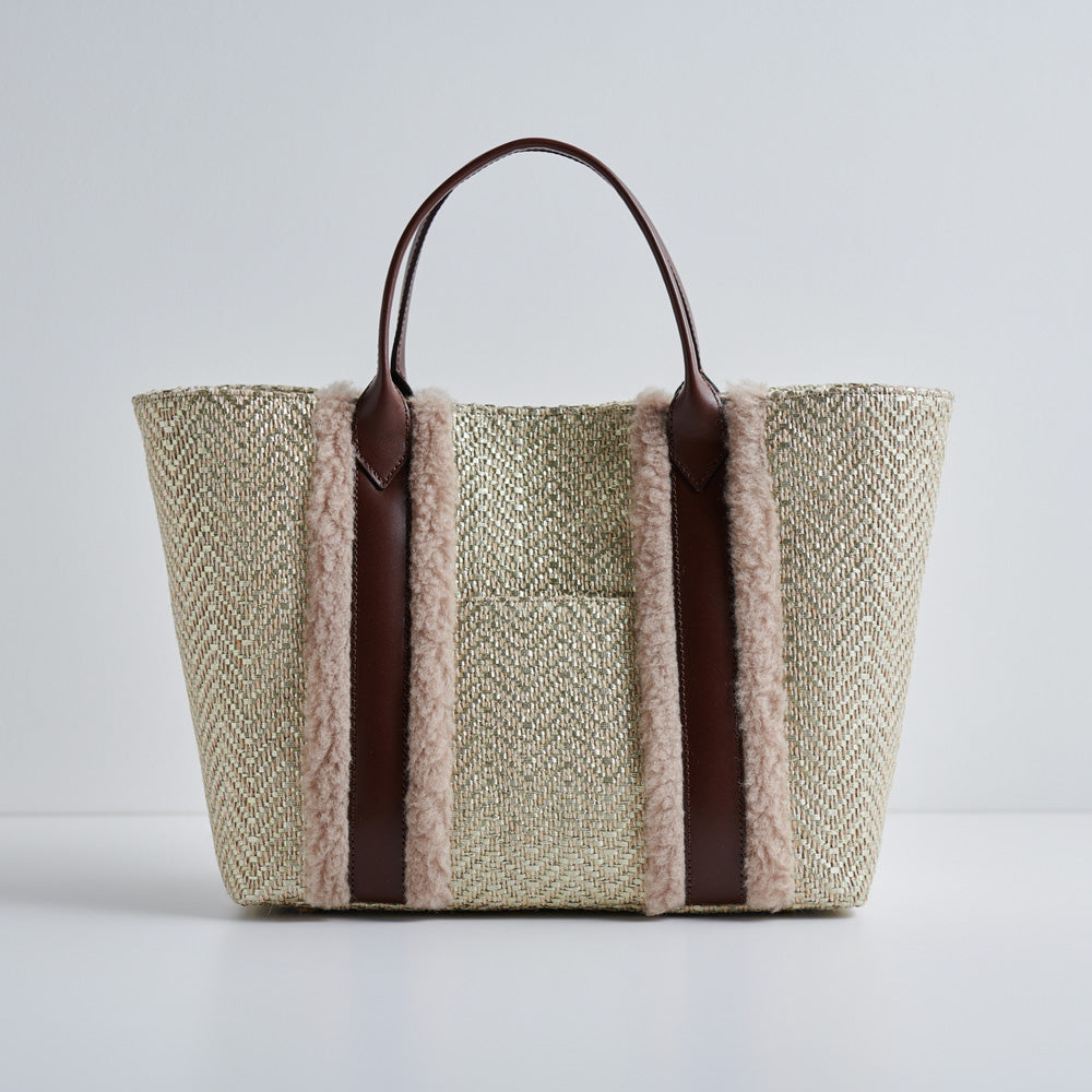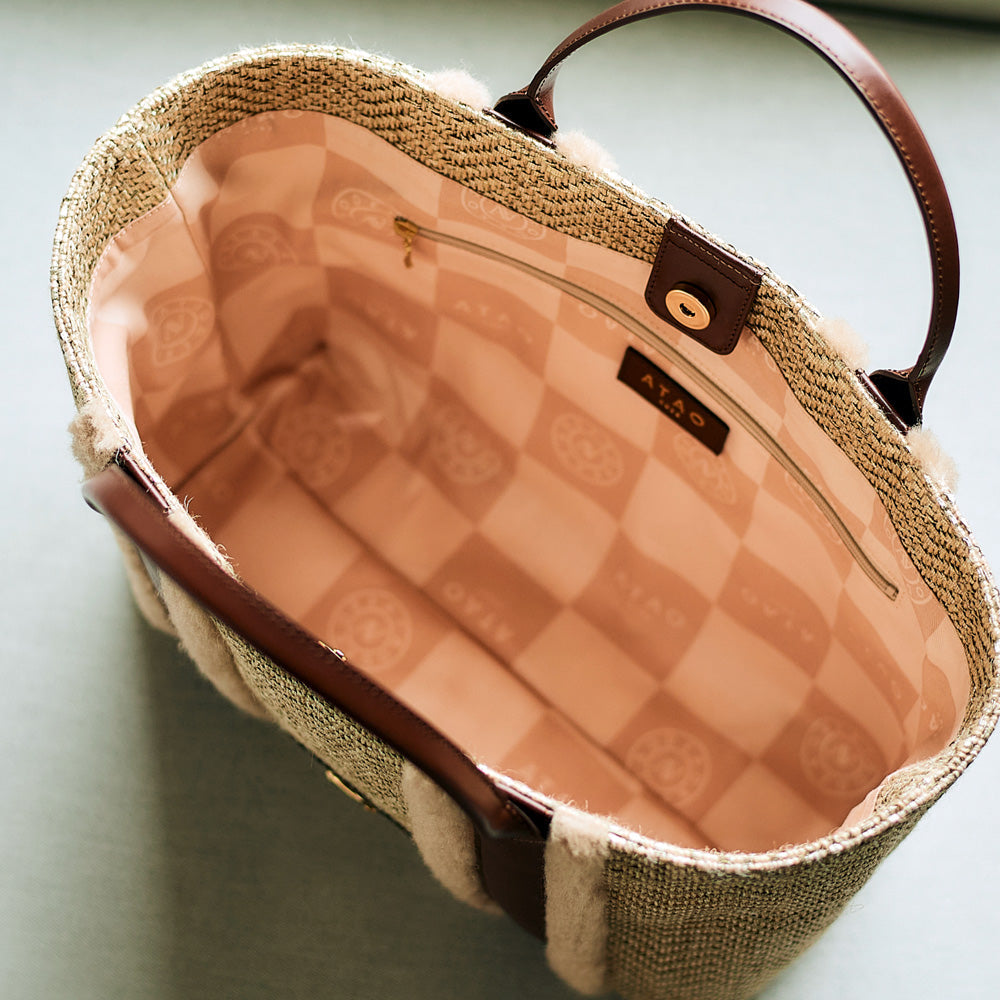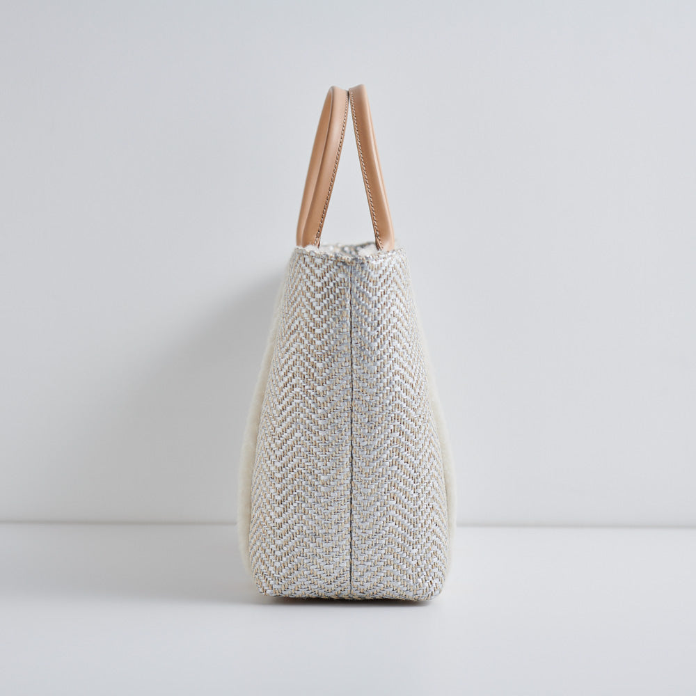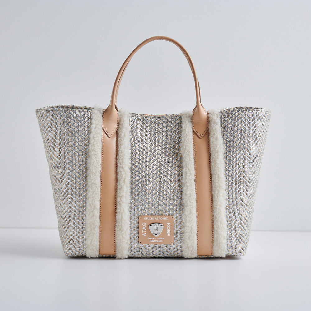 京都の職人が編み込んだ、ヘリンボーン柄のジュートバッグ「shiki」。ジュート素材に加え、心地よい優しい手触りのウール素材に、レザーのハンドルを組み合わせているので、シーズンレスでご使用いただけます。素材から縫製まで全て日本メーカーで育てた春夏秋冬お楽しみいただけるトートバッグです。カラーはハイニッケルの金具を使用したプラチナに、ゴールドの2色展開。ATAO(アタオ)(あたお)(トートバッグ)(ジュート素材)(麻)(軽量)(ハンドバッグ)(シキ)(shiki)(四季)(羊毛)(ウール)